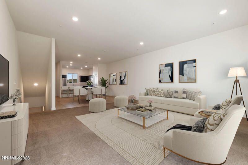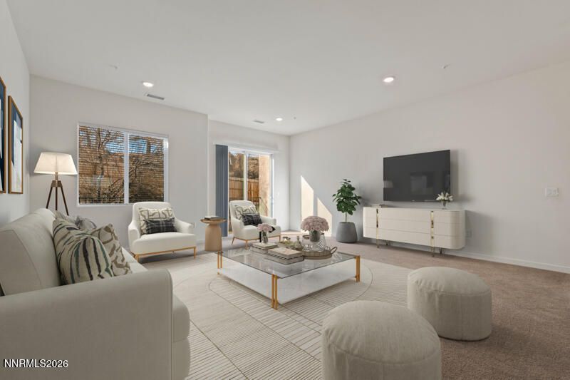 Welcome to Falcon Ridge, a gated community located just outside the North McCarran Loop. This nearly new townhome features three bedrooms and 2.5 baths, finished with clean white paint and ready for your personal touch. The kitchen is equipped with granite countertops, dark cabinetry, stainless steel appliances, a breakfast bar, and a walk-in pantry. Adjacent to the kitchen, the spacious family room provides ample space for a sectional sofa and additional furnishings. Upstairs, the primary bedroom includes dual sinks and a large walk-in closet. Down the hall, you will find two additional well-sized bedrooms, a guest bathroom, a laundry area, and a linen/storage closet. Outdoor living includes a large deck located just off the living room, and the 860-square-foot garage offers extensive storage space. The property's central location provides easy access to freeways, shopping, UNR, and is only a short drive to Lake Tahoe. For your convenience, the washer, dryer, and refrigerator are included.